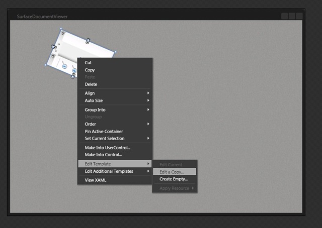 I then opened the project in Expression Blend so that I could get a copy of the “default” style/template for the DocumentViewer control. Opening the project in Blend, right click on the DocumentViewer, and select Edit Template | Edit a Copy…, as shown