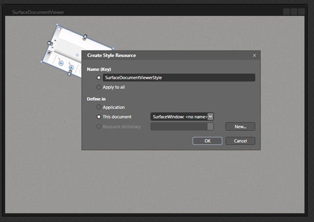 Name the style (I used SurfaceDocumentViewerStyle), and define a location for it (I left it in the SurfaceWindow1.xaml file), as shown below.